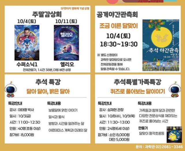 우선, 과학 영화(SF) 상영은 10월 매주 토요일 오후 3시 30분에 천체투영실에서 진행된다. 수퍼소닉1(4일), 엘리오(11일), 앤트맨(18일), 2001 스페이스 오디세이(25일) 등 작품을 무료 관람할 수 있으며, 사전 예약이 필요하다.