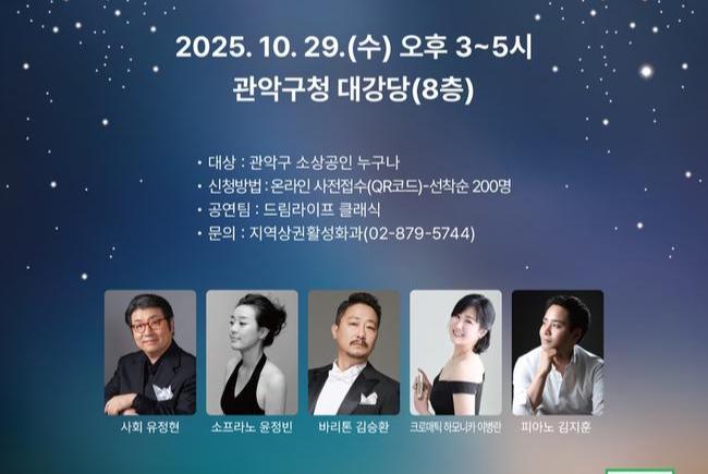 이번 콘서트는 '제4기 관악구 상인대학' 교육과정의 일환으로, 상인대학 수강생을 비롯해 지속되는 경기침체로 인해 위축된 관내 소상공인들을 위로하고자 구가 마련했다.