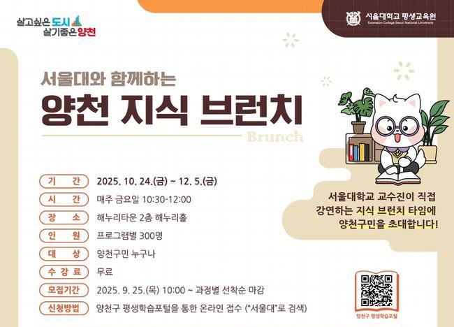 이기재 양천구청장은 "서울대와 함께하는 고품격 평생학습 특강에 많은 구민이 참여해 주시길 바란다"며 "평생학습은 삶의 성장과 발전을 이끄는 원동력인 만큼, 그 가치를 지속적으로 실현하기 위해 최선을 다하겠다"고 말했다.