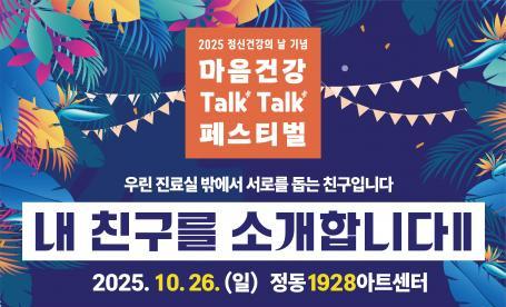 대한신경정신의학회와 대한정신건강재단은 ‘2025 정신건강의 날’을 맞아 오는 10월 ‘마음건강 Talk Talk 페스티벌 - 내 친구를 소개합니다Ⅱ’를 개최한다. 이번 행사는 정신건강의학과 의사, 환우, 시민, 그리고 사회 각계의 인사들이 한자리에 모여 마음을 나누고 위로를 전하는 공감의 장으로 마련됐다.