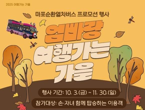 마포구(구청장 박강수)가 후원하고 마포구시설관리공단이 주최, 주관하는 마포순환열차버스 프로모션 행사 '엄빠랑 여행가는 가을'이 11월 30일까지 운영된다.