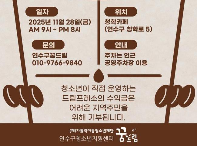 연수구학교밖청소년지원센터 '꿈드림'(센터장 이은선)은 오는 28일 청학카페(청학로 5)에서 학교 밖 청소년이 직접 운영하는 일일 카페 '드림프레스'를 연다.