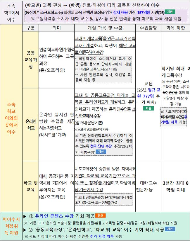 전국 단위 온라인 수강과 고교-대학 연계 학점 인정 과목을 통해 학교 밖 학습 기회도 넓힌다. 단위학교에서 개설되지 않은 과목의 이수 노력은 교육과정 편제표를 통해 대학에 제공된다.