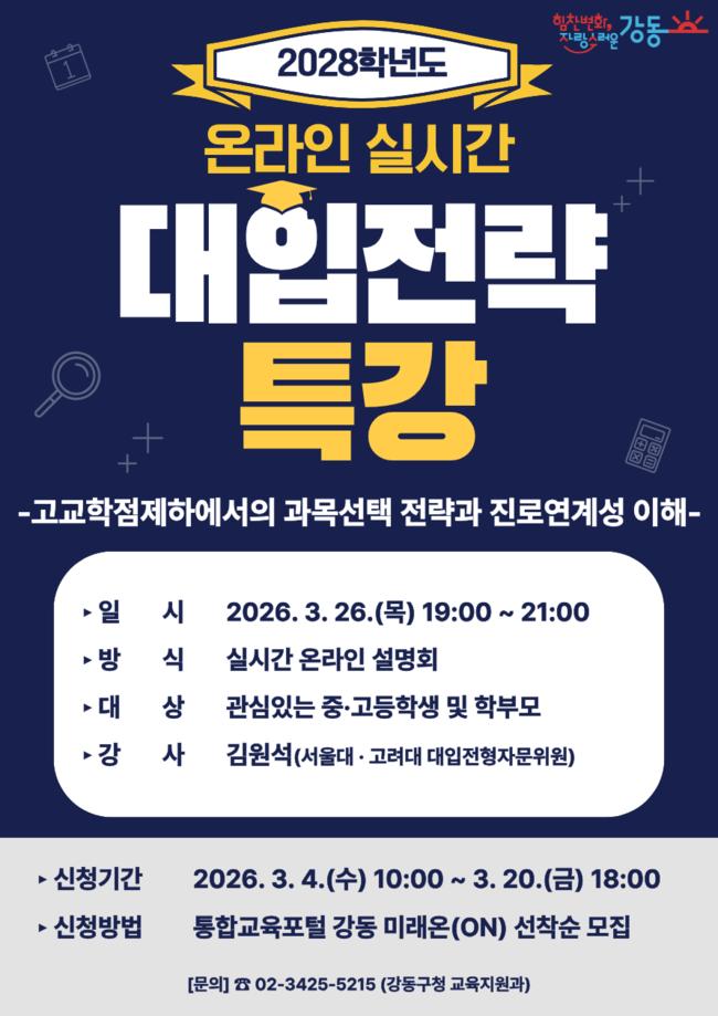 2028학년도 대입전략 온라인 특강 홍보 포스터.서울 강동구(구청장 이수희)는 2028학년도 대입제도 변화에 대비하기 위해 온라인 대입전략 특강을 개최한다고 17일 밝혔다. 이번 특강은 직장인 학부모의 참여 편의를 고려해 저녁 시간대에 온라인 방식으로 운영된다.