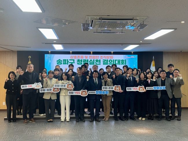 송파구 청렴실천 결의대회.송파구는 전 부서가 참여하는 '2026년도 종합청렴도 향상 추진계획'을 수립했다고 25일 밝혔다. ▲부패예방 체계 강화 ▲소통 중심 조직문화 조성 ▲전 직원 청렴 실천 ▲구민 참여·협력 강화 등 4대 전략을 축으로 한다.