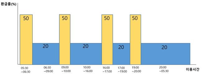 정부는 출퇴근 시간대 혼잡 완화를 위해 시차 이용 인센티브도 도입했다. 오전 5시30분~6시30분, 9시~10시, 오후 4시~5시, 7시~8시 등 지정된 시간대에 대중교통을 이용할 경우 정률제 환급률을 최대 30%포인트 상향한다. 이에 따라 일반 국민은 최대 50%, 청년과 다자녀 가구는 최대 60~80%, 저소득층은 최대 83.3%까지 환급을 받을 수 있다.