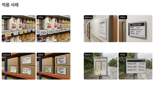 종이 인쇄물 기반 안내 방식과 전자잉크(E-Paper) 디스플레이 적용 사례 비교 이미지. 기존 종이 안내판, 가격표, 물류 라벨, 교통 안내판 등이 전자잉크 디스플레이로 전환되면서 콘텐츠 변경의 편의성과 운영 효율 측면에서 개선이 가능한 구조를 나타낸다. 또한 종이 사용을 줄일 수 있는 방식으로 활용 가능하다