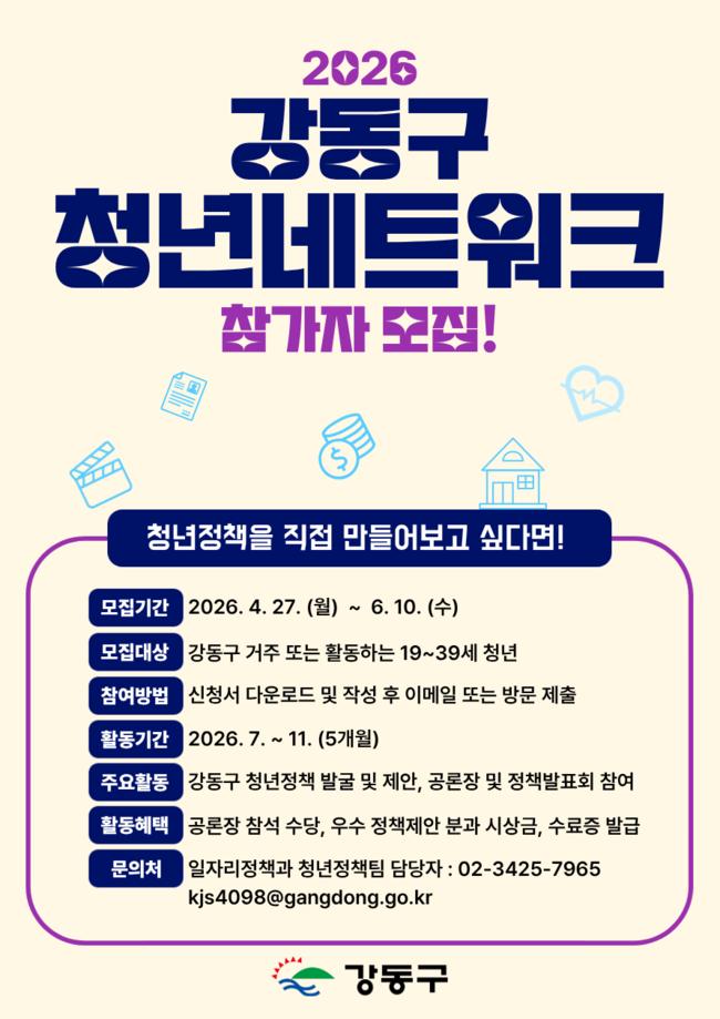 2026 강동구 청년네트워크 포스터.서울 강동구(구청장 이수희)는 '2026년 강동구 청년네트워크' 참여자 30명을 오는 6월 10일까지 모집한다고 28일 밝혔다.