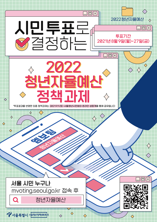 서울시가 청년들이 스스로 기획·제안하고 시민들의 투표로 확정되는 `2022년 서울시 청년자율예산` 82개 정책에 대한 온라인 대시민 투표를 27일까지 서울시 엠보팅을 통해 진행한다고 밝혔다.