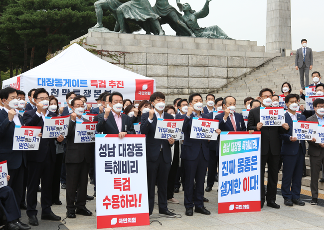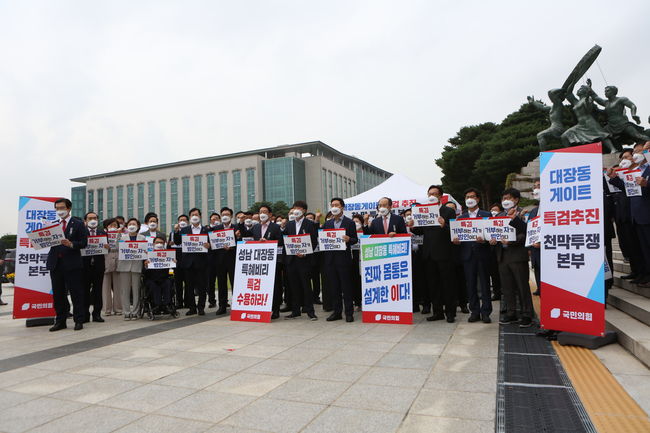 야당은 이날 오전 국회 본관 앞에서 `대장동 게이트 특검 추진 천막투쟁본부 출정식`을 개최했다. 출정식에 참여한 의원들은 `판교 대장동 게이트 특검 수용하라` 문구가 쓰인 마스크를 쓰고 가슴에 근조 리본을 달았다.