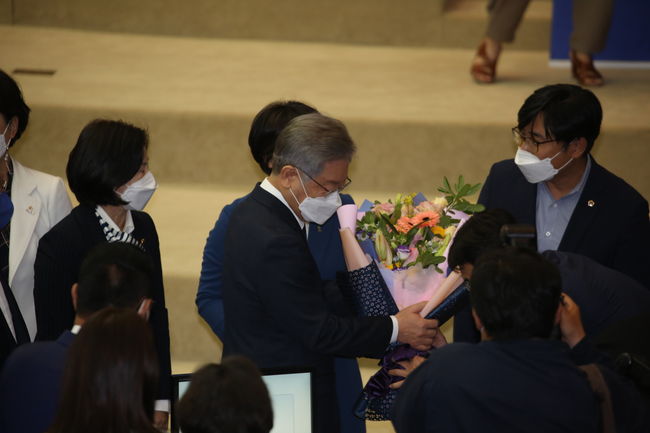 더불어민주당의 대선 후보로 선출된 이재명 경기도지사가 12일 열린 경기도의회 제355회 임시회 2차 본회의에 참석하자 도의회 의원들은 축하세례를 퍼부었다.이 지사는 본회의장에서도 여러 의원들과 기념사진을 찍으며 환한 표정을 지었다.