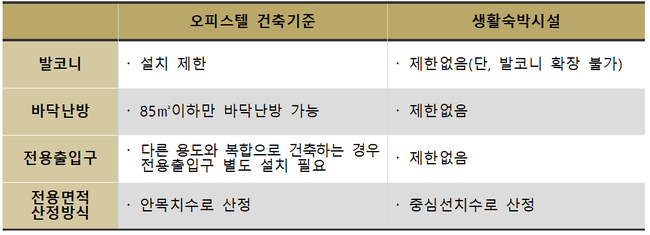 오피스텔 건축기준 중 한시적 완화 규정 (자료=국토교통부)생활숙박시설은 장기투숙 수요에 대응해 취사 포함 서비스를 제공하는 숙박시설로 보건복지부의 `공중위생관리법 시행령` 개정을 통해 2012년부터 도입된 바 있다.