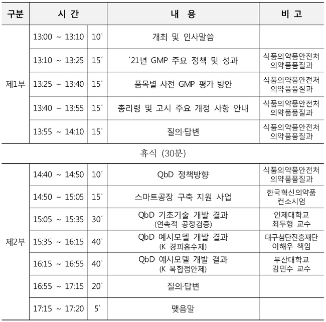 2021년 GMP 정책설명회 및 QbD 워크숍 일정 (자료=식품의약품안전처)