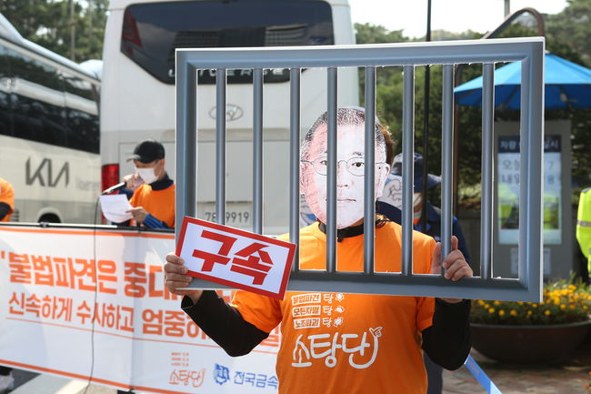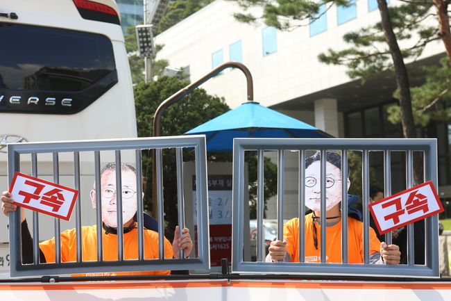 전국금속노조 현대 · 기아자동차 비정규직 공동투쟁단이 19일 현대자동차그룹 본사 앞에서 기자회견을 열고 안동일 현대제철 사장과 정의선 현대자동차 회장의 구속을 촉구하는 퍼포먼스를 진행하고 있다.