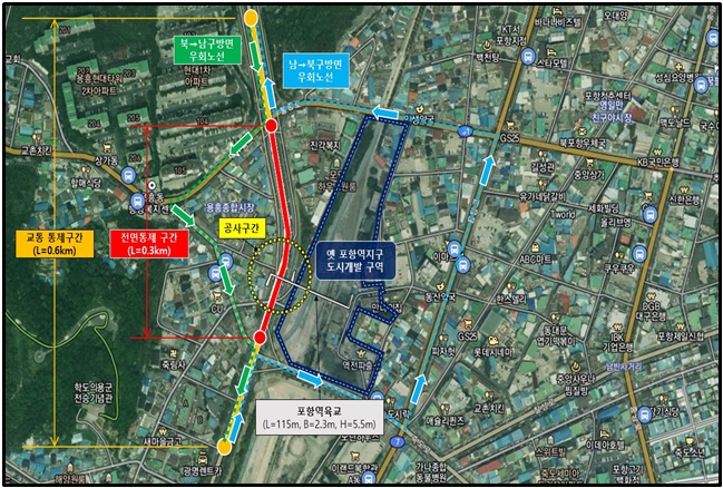 육교 철거는 교통여건을 고려해 영향을 최소화할 수 있는 심야시간인 29일 오후 11시부터 익일 오전 6시까지 차량을 전면 통제하며, 통제구간은 용흥현대아파트 ~ 구 포항역사거리까지 왕복 6개 차로이다.