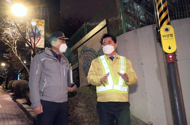 여성안심귀갓길에 설치된 비상벨 작동을 점검 중인 박준희 구청장