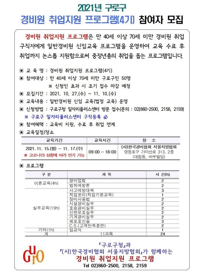 구로구가 관내 중장년층을 대상으로 ‘경비원 취업지원 프로그램’을 운영한다.