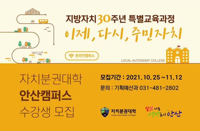 안산시는 지방자치 부활 30주년과 함께 새로운 자치분권 시대에 걸맞은 주민자치 역량을 강화하기 위해 ‘2021년 가을학기 자치분권대학 안산 캠퍼스’를 개설하고 11월 12일까지 수강생을 모집한다고 25일 밝혔다.