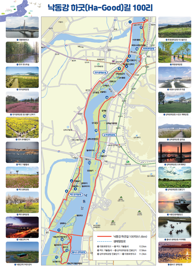 ‘100리길’은 그간 개별적으로 조성된 5개 생태공원 산책로를 순환 연결한 것으로, 도보로는 약 9시간 30분, 자전거로는 약 4시간이 소요되는 약 40Km 규모의 길이다. ‘하굿길’의 영문명 ‘Ha-Good Trail’은 ‘웃음소리(Ha)’와 ‘좋다(Good)’라는 ‘긍정’의 의미와 생태공원 길(Trail)을 탐방할 수 있는 ‘치유’를 주요 컨셉으로 기획됐다.