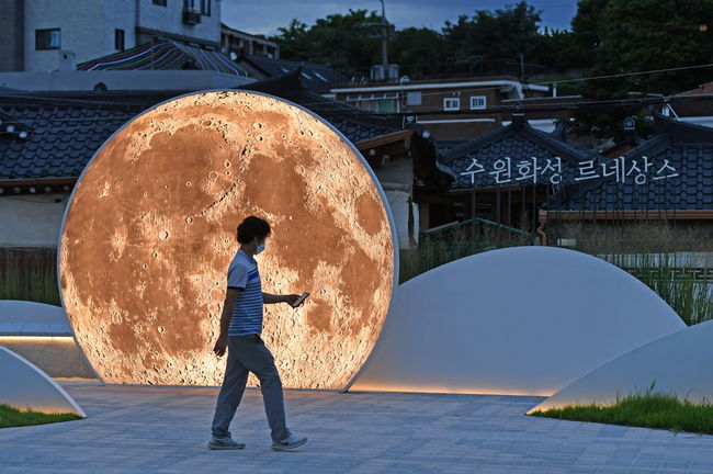행궁동 도시재생사업의 일환으로 남수동 길가에 조성된 경관조명 `팔달산에 뜨는 달` 앞으로 한 시민이 지나가고 있다.