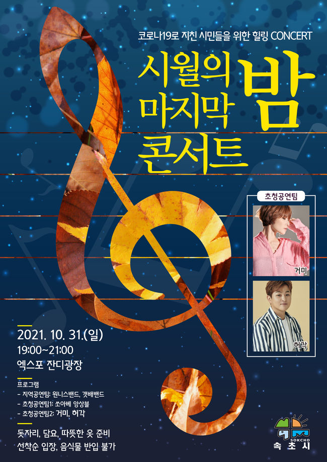속초시는 코로나19로 지친 시민과 관광객에게 힐링의 시간을 선사하기 위해‘시월의 마지막 밤 콘서트’를 10. 31.(일) 저녁 7시부터 엑스포 잔디광장에서 개최한다.