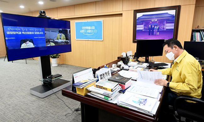 박남춘 인천광역시장이 26일 시청 집무실에서 온라인으로 열린 `10월 시민안전정책회의`에서 주요 안건을 논의하고 있다