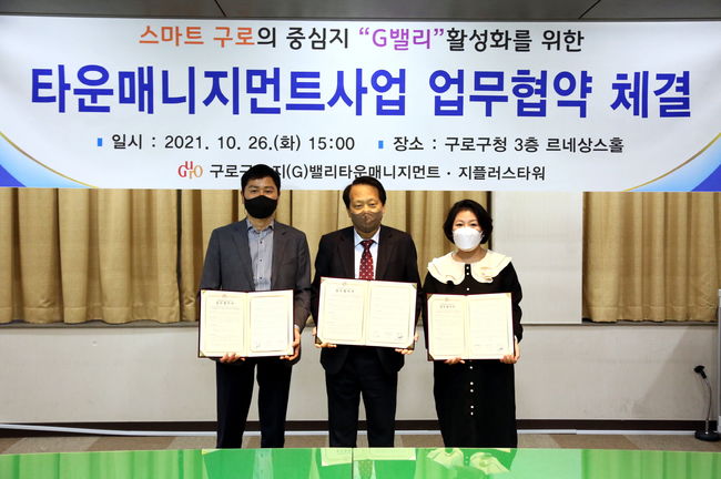 구로구가 26일 지(G)밸리 타운매니지먼트 비영리 임의단체, 지플러스타워 입주자 협의회와 업무협약을 체결했다.