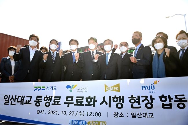 일산대교가 경기도의 공익처분 시행으로 27일 정오를 기점으로 전면 무료화한 가운데, 이날 도는 김포시, 고양시, 파주시와 함께 ‘일산대교 통행료 무료화 시행 현장 합동 발표 행사’를 열었다.