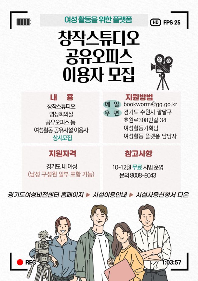 경기도 내 여성이라면 누구나 연말까지 경기도여성비전센터에서 유선(031-8008-8043)으로 사전 예약 후 사용할 수 있다. 해당 공간에는 무선마이크, 삼각대, 카메라, 조명 등도 있어 온라인 강의, 유튜브 콘텐츠 제작, 취업관련 영상 제작 등이 가능하다. 또한 영상회의실과 사무 공간에서 소규모 회의 및 소모임도 할 수 있다.