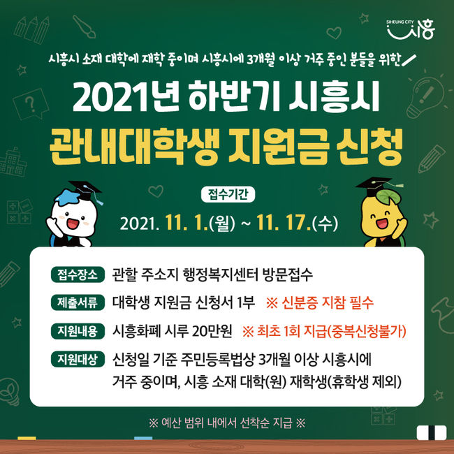 시흥시가 오는 11월 1일부터 17일까지 2021년 하반기 시흥시 관내 대학생 지원금을 각 동 행정복지센터에서 신청·접수받는다.