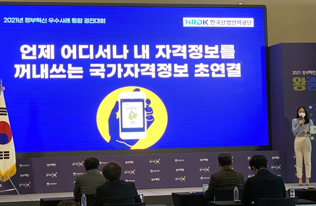 협업분야 동상을 수상한 `내 국가자격증, 스마트폰에 담아 필요할 때 간편하게 열어서 써요`는 행정안전부·네이버·카카오 등과 협업해 종이서류 없이 자격정보를 확인할 수 있는 자격정보 전자 시스템을 구축해 국민 누구나 스마트폰을 통해 자격정보를 활용할 수 있는 플랫폼을 구축한 점이 공공서비스 혁신 모범사례로 인정받았다.