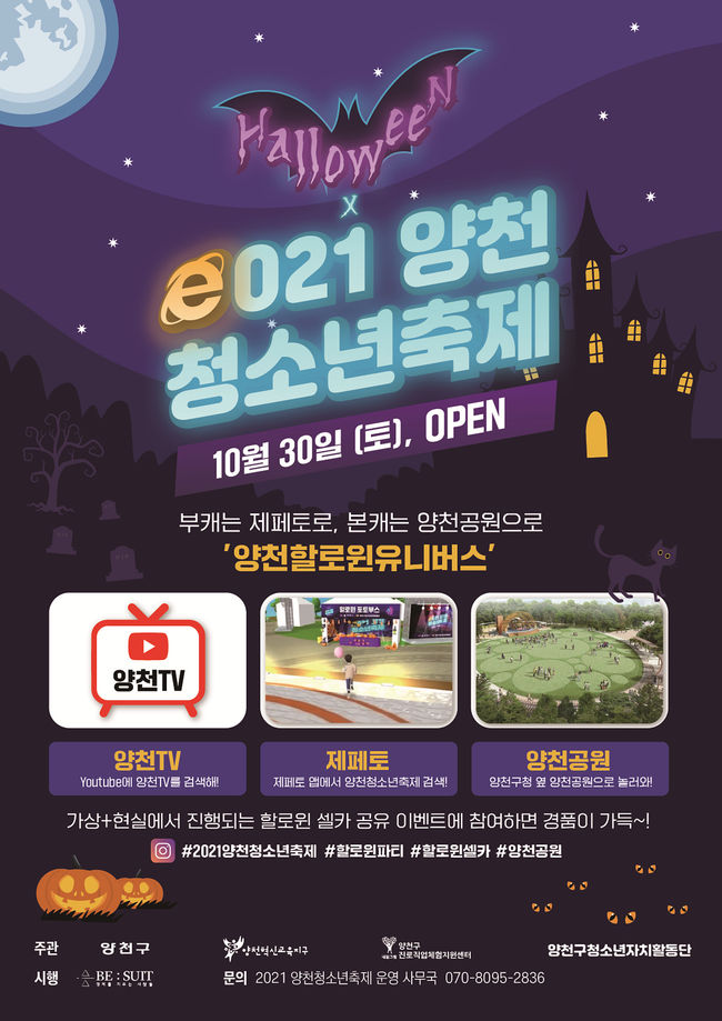 ‘e021 양천청소년 축제’는 양천혁신교육지구 청소년자치활동단이 기획에서부터 운영까지 직접 하나하나 정성을 들인 청소년들의 문화축제다. 위드코로나 시대의 ‘안전 감수성’과 MZ세대 청소년들의 ‘소통 감수성’을 반영하여 공간의 제약 없이 자유롭게 참여하도록 ▲양천공원(현실세계), ▲제페토(메타버스 가상공간), ▲양천TV(유튜브) 총 3가지 채널로 운영된다.