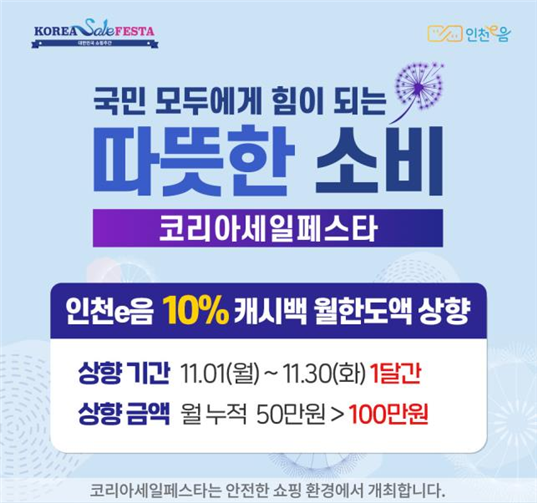 인천광역시는 11월 1일부터 30일까지 한 달 동안 인천지역사랑상품권 인천e음의 캐시백 10% 한도를 결제액 50만 원에서 100만 원으로 상향한다고 밝혔다.