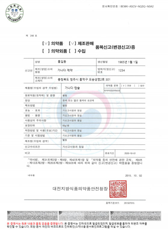 전자허가증 예시 (자료=식품의약품안전처)