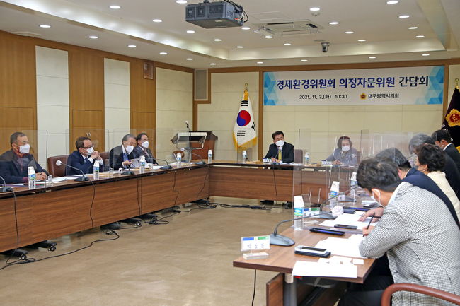 대구광역시의회 경제환경위원회는 행정사무감사와 내년도 예산심사를 앞두고 11월 2일(화) 오전 10시 30분 시의회 3층 회의실에서 경제‧산업‧환경분야 등 외부 전문가로 구성된 의정자문위원과 소속 의원 간 간담회를 개최하여 시정 주요 현안에 대한 전문가 의견을 청취하고 토론하는 시간을 가졌다.