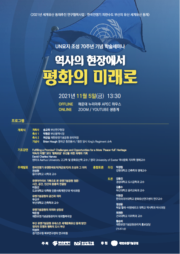 이번 학술세미나는 ‘피란수도 부산의 유산’을 세계유산으로 등재하기 위한 연구협력사업의 일환으로, 과거 유엔묘지가 조성되던 시점부터 역사적인 흐름을 되짚어 보고 오늘날 재한유엔기념공원이 ‘피란수도 부산의 유산’으로서 가지고 있는 가치와 의미들을 함께 살펴보기 위해 마련됐다. 부산시와 부산연구원이 함께 주최하고 재한유엔기념공원 관리처가 후원한다.