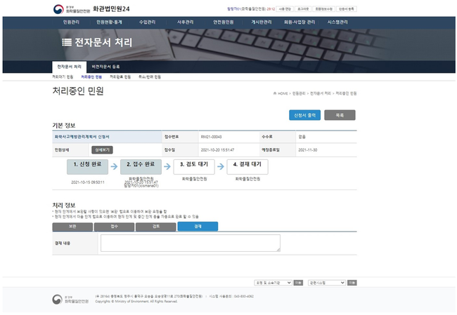 민원인은 온라인 상에서 화학사고예방관리계획서를 제출한 후 심사현황을 수시로 확인할 수 있으며, 최종심사결과도 민원인에게 자동으로 통보된다.