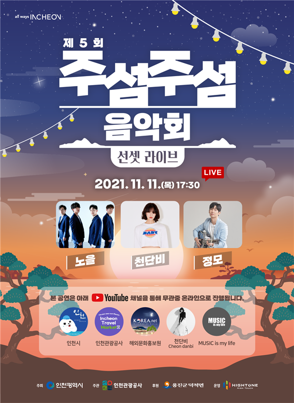 인천광역시가 주최하고 인천관광공사가 주관하는‘제5회 주섬주섬 음악회’가 11월 11일 오후 5시30분부터 온라인 생중계로 개최된다.