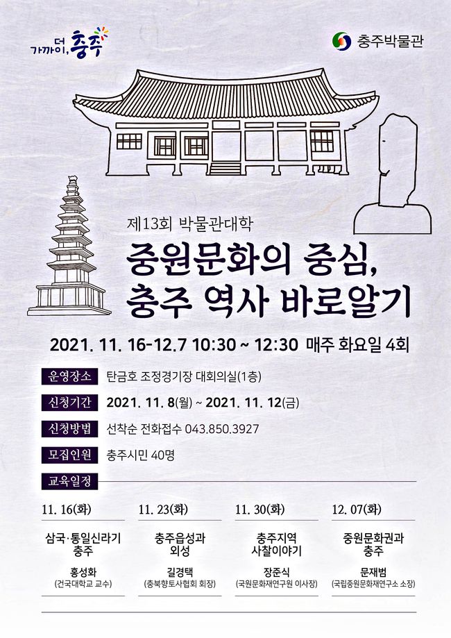 충주박물관은 오는 16일부터 12월 7일까지 매주 화요일 ‘중원문화의 중심지, 충주의 역사를 알자!’를 주제로 ‘제13회 박물관 대학’을 운영한다.