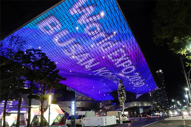 부산시는 2030부산세계박람회 성공개최를 응원하기 위해 영화의 전당 빅루프에 엑스포 문구와 로고 이미지를 LED 경관조명으로 표출한다고 밝혔다.