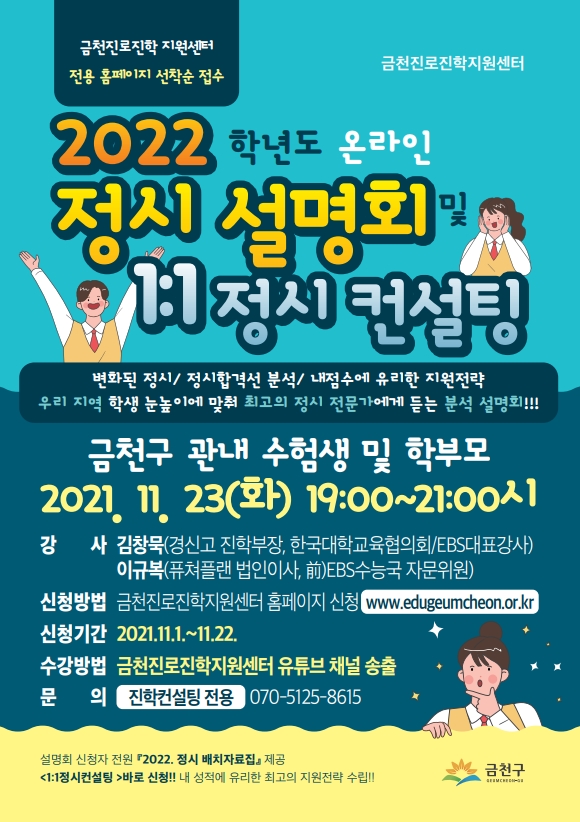 금천구가 11월 23일(화) 오후 7시 금천진로진학지원센터 유튜브 채널을 통해 ‘2022학년도 정시 지원전략 수립 지원을 위한 온라인 입시설명회’를 개최한다고 밝혔다.