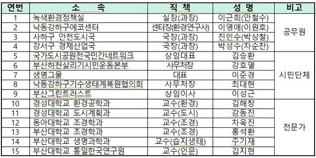 이날 회의에는 시 관계 공무원과 민간위원인 김승환 국가도시공원전국민간네트워크 상임대표, 강호열 부산하천살리기시민운동본부 사무처장, 주기재 교수 등이 참석할 예정이다.