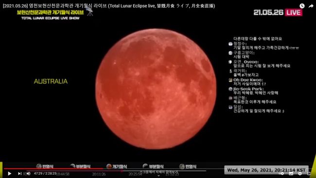 영천시 보현산천문과학관에서는 지난 5월 26일에 있었던 개기월식 때에도 유튜브로 실시간 중계를 하며 순간 최대 접속자 1,933명, 누적 조회수 약 66,996명 정도가 접속하면서 큰 호응을 얻었고, 누리꾼들은 신비로운 달의 모습을 보며 실시간 채팅으로 수많은 소원들을 올리는 진풍경이 연출되기도 했다.