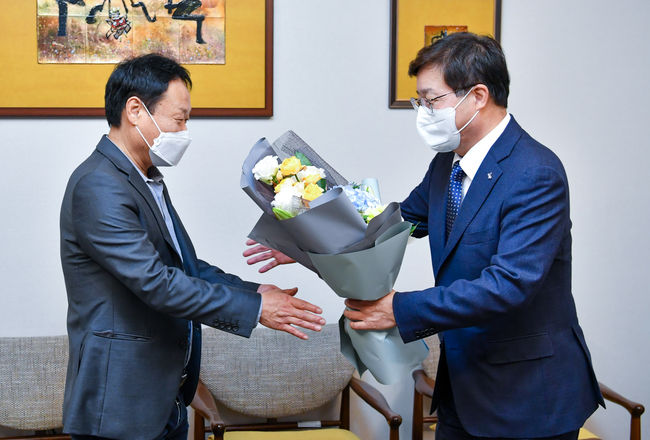 염태영 시장(오른쪽)이 뮤직 콘서트 후 곽재용 감독에게 꽃다발을 전달하고 있다.