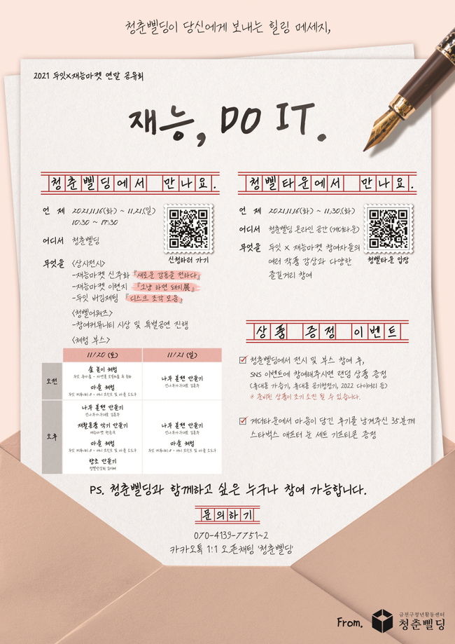 청년활동 공간 청춘삘딩이 주관하는 이번 행사는 청년커뮤니티 지원사업 ‘두잇’ 과 문화예술인 청년프리랜서 지원사업 ‘재능마켓’ 참여자들의 그간 활동 과정을 다양한 전시와 부스 운영을 통해 소개하고, 금천구민 모두 함께 즐길 수 있도록 다채롭게 꾸며진다.