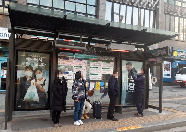 지난해 관악구청 버스정류장에 설치한 smart 냉온풍기 아래서 시민들이 버스를 기다리고 있다.
