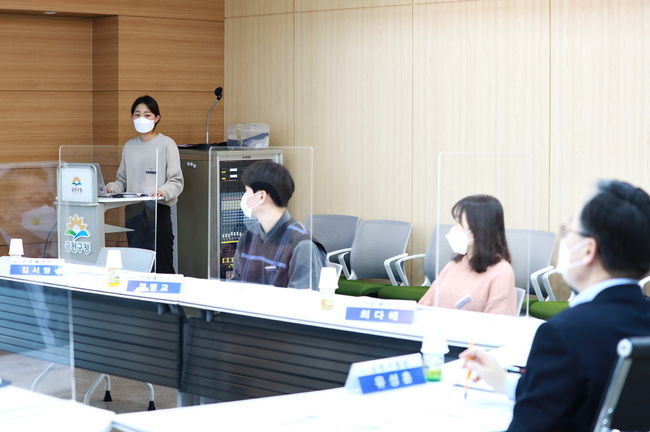 2021년 1월 겨울방학 대학생 아르바이트 중 `구정제안단 프로그램`에 참여한 청년들이 자신들이 기획한 구정 사업을 발표하고 있다