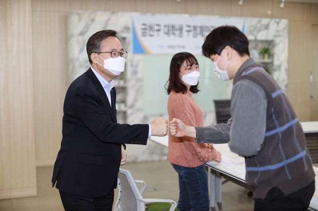 2021년 1월 겨울방학 대학생 아르바이트 중 `구정제안단 프로그램`에 참여한 청년들이 유성훈 구청장과 만남의 시간을 가지고 있다이번에 모집하는 인원은 ‘일반선발’ 70명, ‘우선선발’ 30명 총 100명이다. 선발된 대학생은 근무 기간 중 구청, 동주민센터, 소속기관 등에 배치돼 행정 사무보조 업무뿐만 아니라 다양한 구정 업무를 하게 된다.
