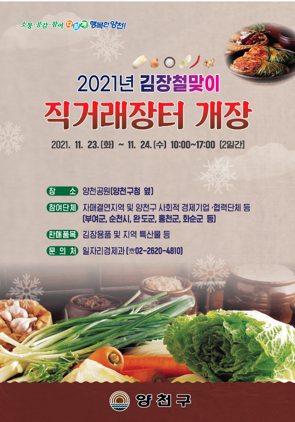 양천공원에서 개최될 김장철 직거래 장터에는 자매결연도시인 부여군, 순천시, 강화군, 완도군 등을 비롯해 그간 꾸준히 참여해온 곡성군, 괴산군, 나주시 등 총 21개 지자체에서 참여할 예정이다. 지역의 특산물 및 절임배추, 김장채소 등 다양한 상품이 판매되며, 주민편의를 위해 양천구 관내 무료배송 서비스도 지원한다.
