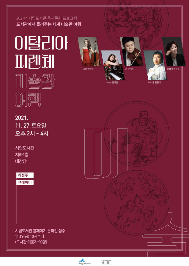 우선 27일에는 세종시립도서관 로비에서 세계미술관여행 ‘피렌체’ 편이 첫 출발을 알린다. 이 공연은 명화와 클래식을 접목한 창의적 강의로 유명한 최정주 강사가 르네상스의 도시 피렌체를 소개한다.